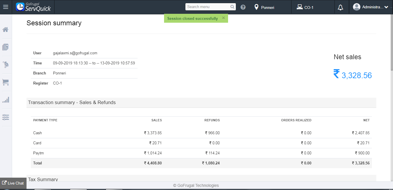Session is closed successfully .You can check the Transaction summary of Sales and Refunds