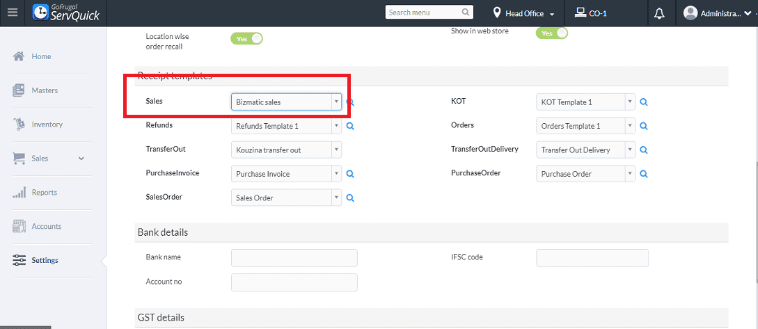 Step 1: Go to Setting->Receipt template