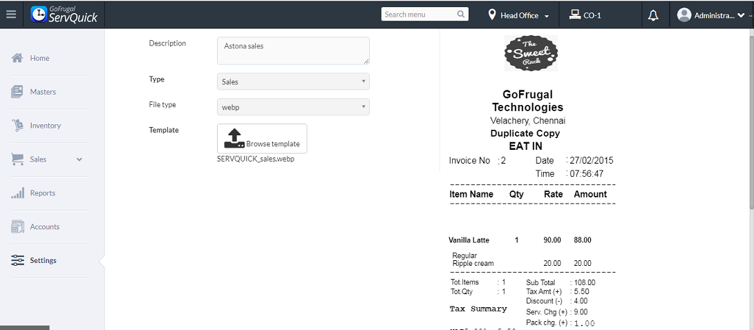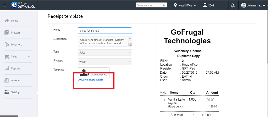 Step 11: After the design is completed save the details and the file in a particular location. Then choose the domain,Go to Settings->receipt template. Select the particular template ,click on edit Browse Template upload the new designed template and click on update to save and see the changes