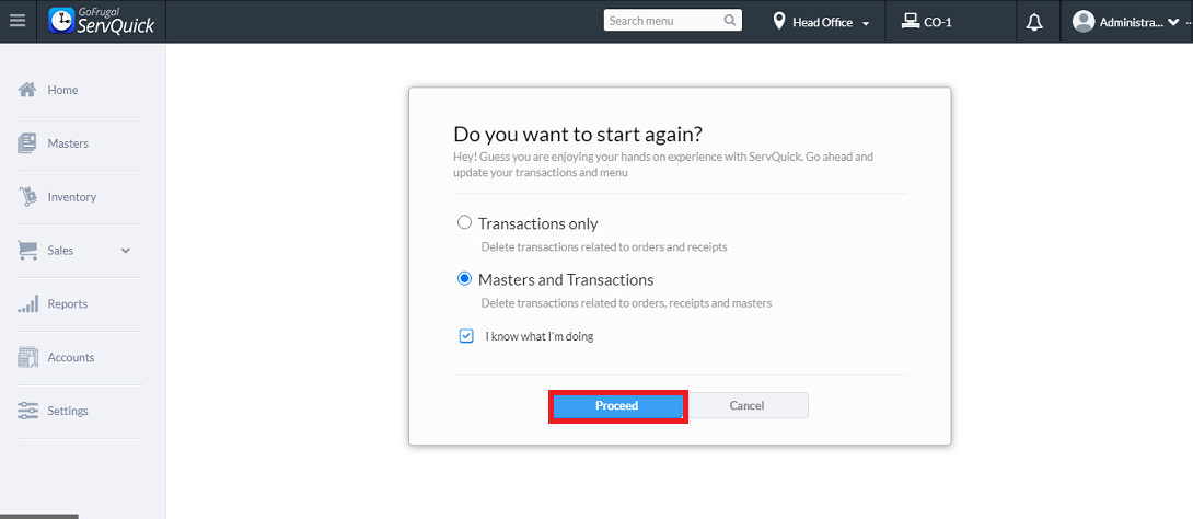 Step 2: In the clear data process you can choose to clear the transactions or both the masters and transactions