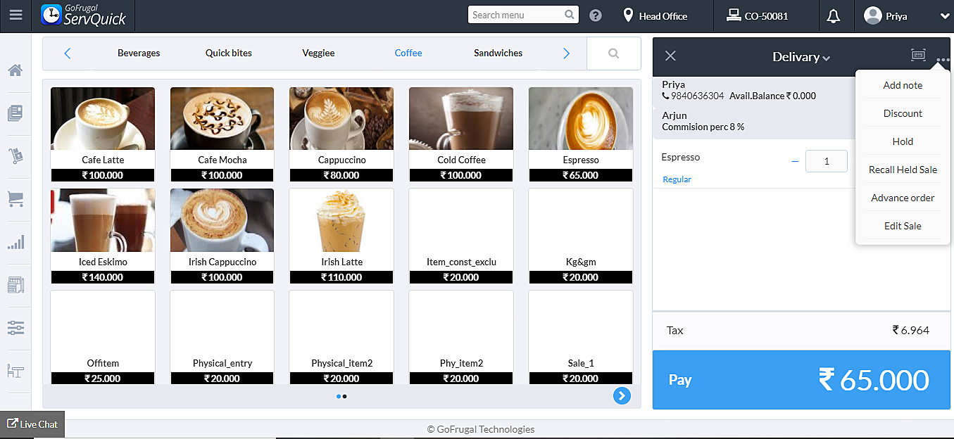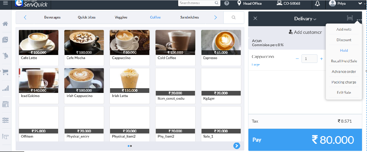 Select the order type and add the item to the cart, choose the salesman and click on more option to Hold the sale