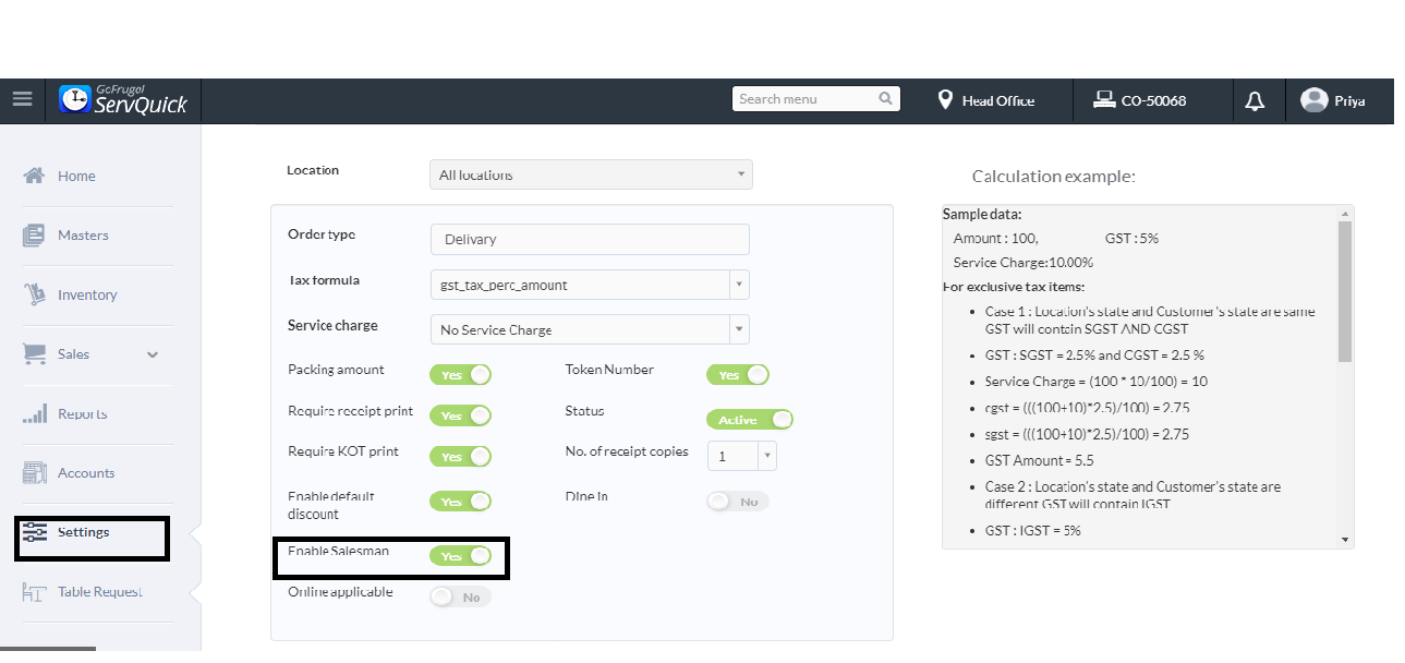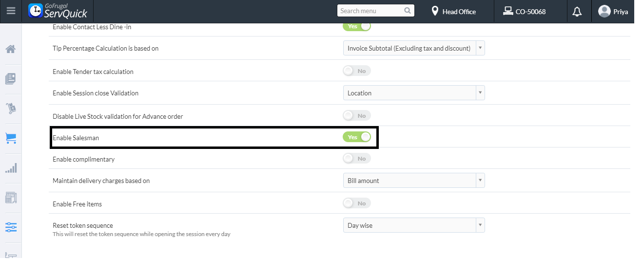 Step 3 : Next, Go to Order Type, change Enable Salesman option from "No to Yes" and Save, The salesman option is not applicable if Dine In option is set as "Yes"