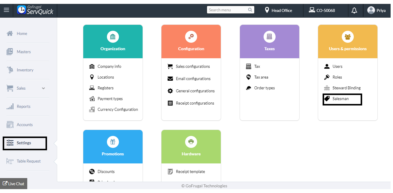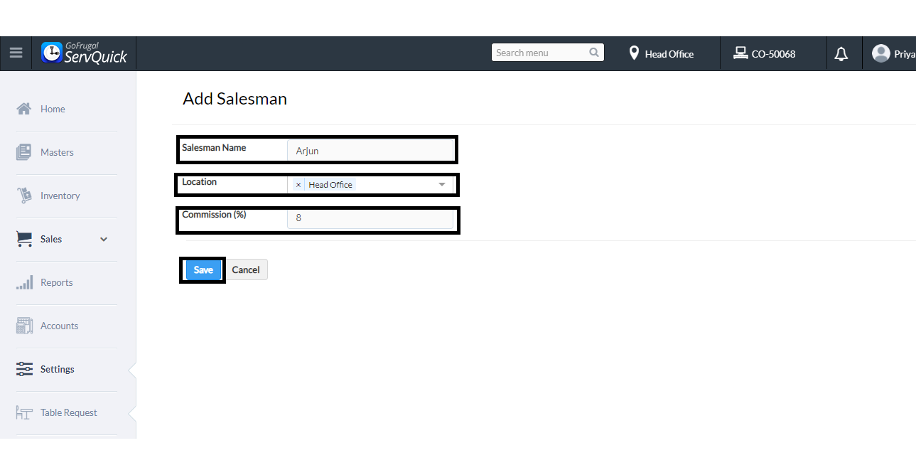 Step 2 : A new menu under Settings-->User & permission called Salesman will be shown, Click on Add Salesman-->fill the desired details i.e. Salesman name, Location and Commission percentage