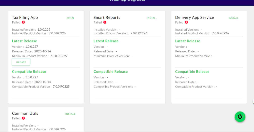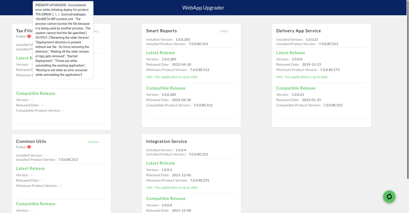 It may be due to one of the following reasons: Problem Troubleshooting Webapp upgrader failed Open webapp upgrader page and check the status. If it says FAILED or some other error reason, click "Retry" button to try again. If still fails, report to ...