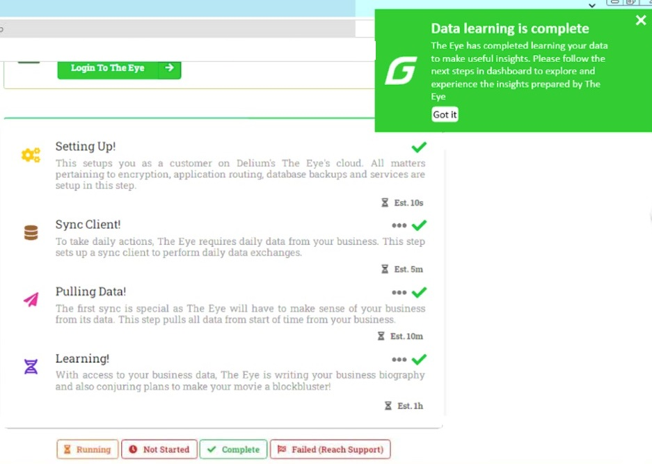 The Eye has been integrated with Gofrugal POS & GoSecure so that login automation can be done automatically in The Eye  from the Gofrugal POS & also the data can be fetched from GoSecure database and that will be available 24x7 even though the POS is OFF. GoSecure Sync will run as per its normal schedule and it will do incremental sync after every 3 minutes. That data will be synced to our Connect Plus database. The sync process The Eye will happen at 5 AM every day.