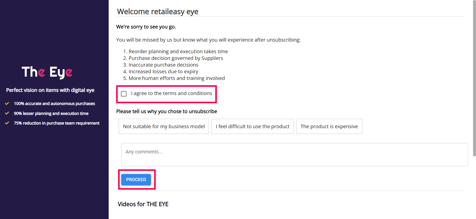 Click on the Unsubscribe link and then click on the check box of "I agree to the terms and conditions", put the reason for Unsubscribe & click on Proceed to unsubscribe from The Eye.