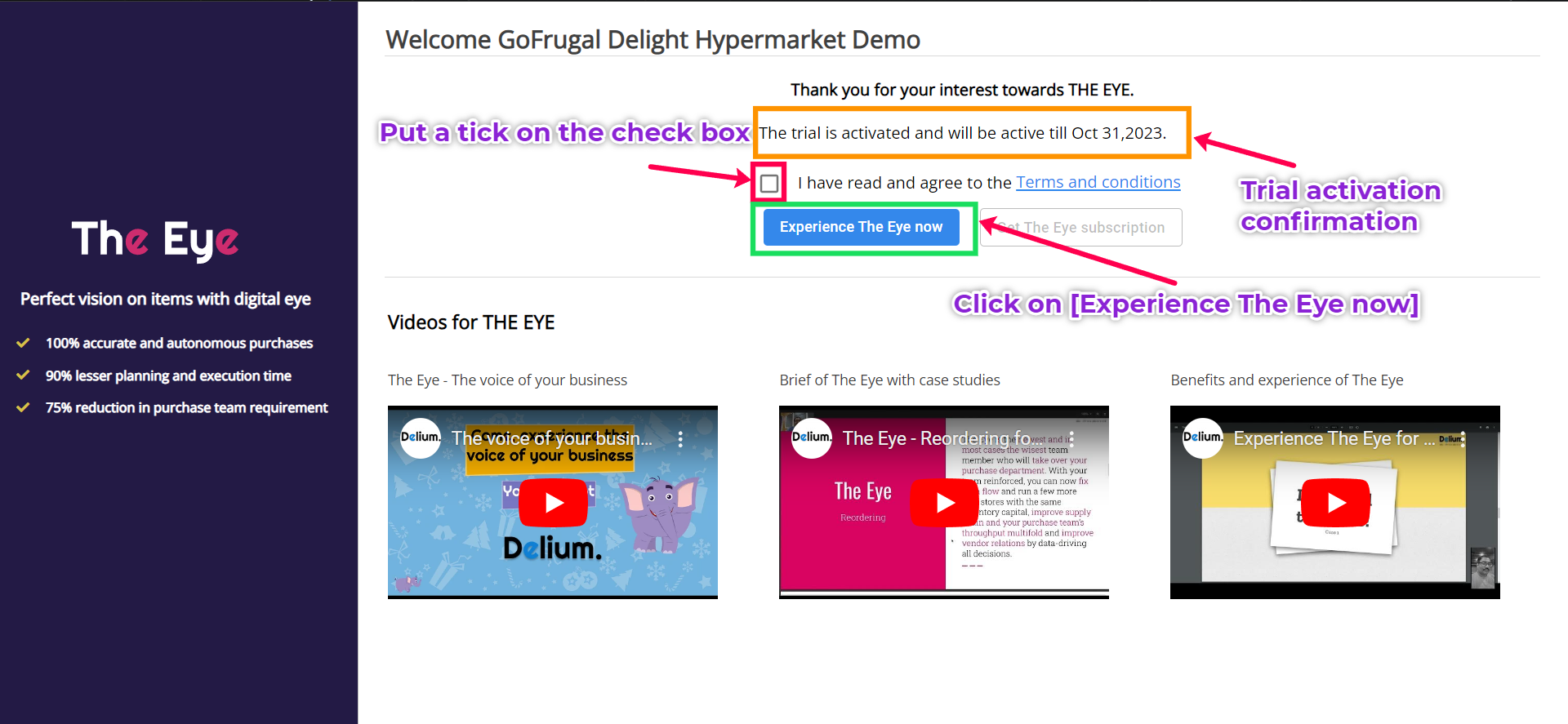 Step 2: Click on the "Experience The Eye now" button to go to the trial activation page.