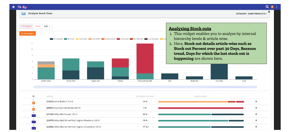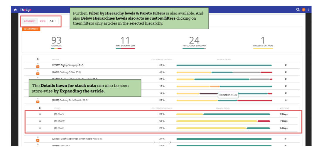 The hierarchy view can also be drilled down to show its underlying subcategories & brands. More details about the article being stocked out such as,