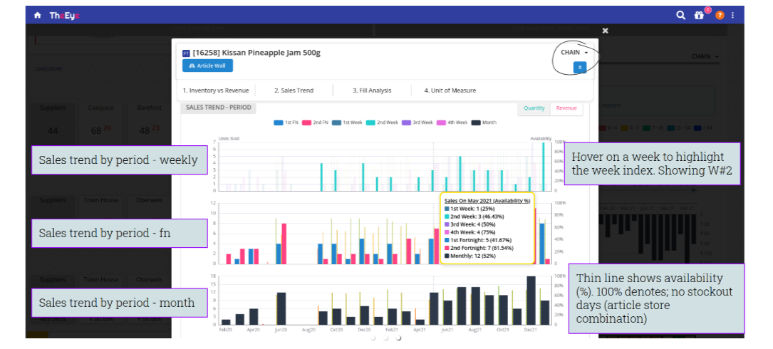 Period-wise sales trend is available on the article flash card. The tooltip has grouped information that will help you view the context of any week with its fortnight and month and vice-versa. Every group is so set up that you see sales along with corresponding product inventory availability. The thin line at the start of every group is the availability indicator. A green full line denoted very good availability. The colour of the availability line takes shades of red and its height reduces as stock-out occurs.