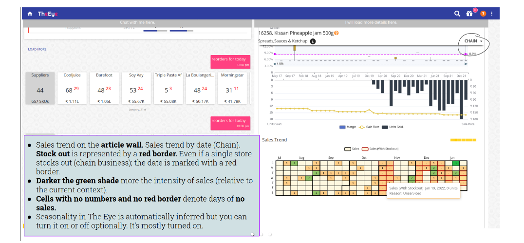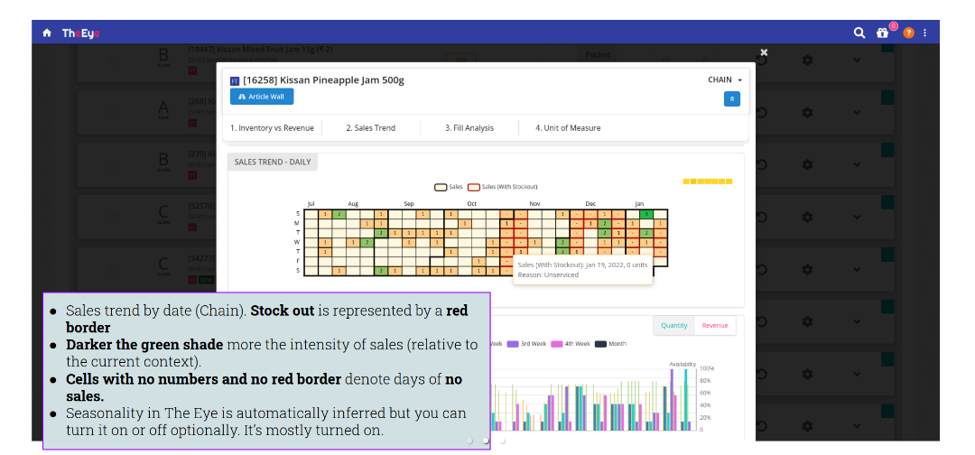 The daily sales trend is available as a calendar heat map on the article wall and the article flash card. Hover on a particular date to view more details in a popup. If a particular date has witnessed a stock-out, the date is bordered in red and the popup on mouse-over has the stock-out reason as shown in the screenshot.