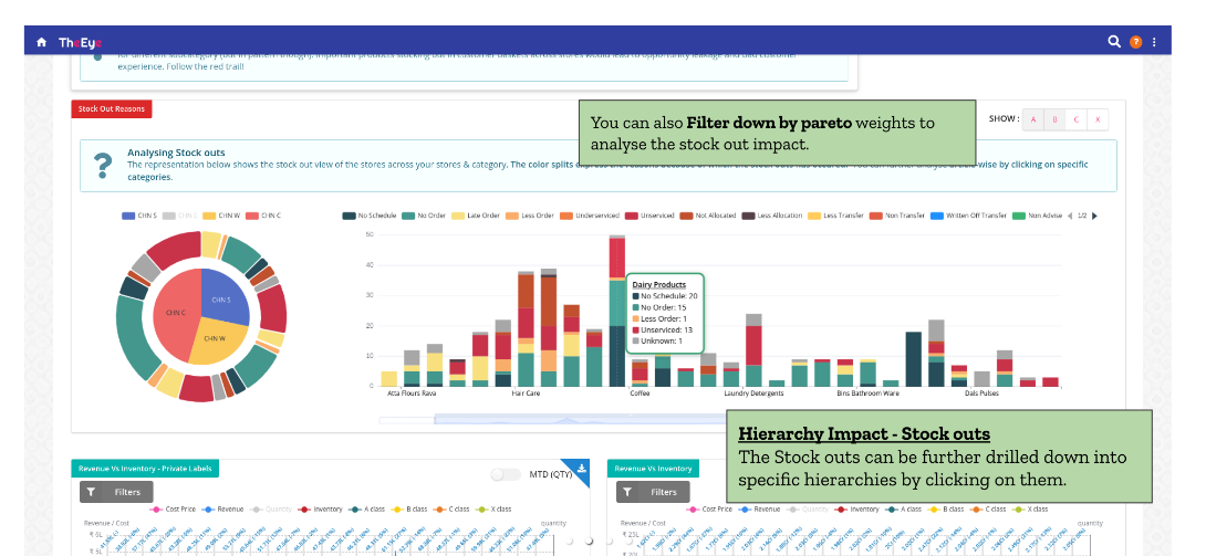 B. Use the Pareto Filters to analyse the stock-out impacts. The Stock outs can be further drilled down into specific hierarchy levels.