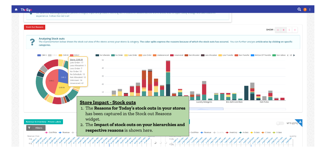 The Stock Out Reasons widget on the Daily News shows the trend of the stock-outs happening in your stores. The Reasons might be planning, Supplier service, Warehouse-Store planning & execution, and a lot more in practice. These Reasons, because of which out-of-stock happens at your stores, have been reported here hierarchy-wise and across your stores [store-wise impact]. The hierarchy-wise representation shows how a particular category has been affected by the above-mentioned reasons.