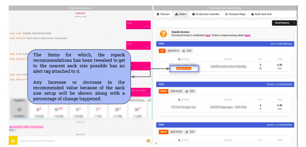 The Increase or decrease in the recommendation due to the sack sizes is reported on the repack planner as well as orders.