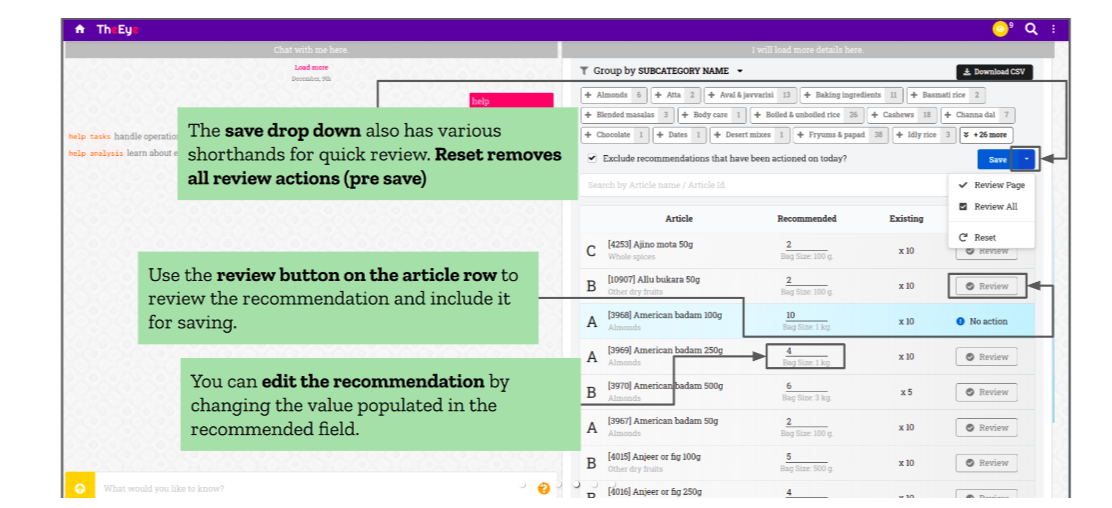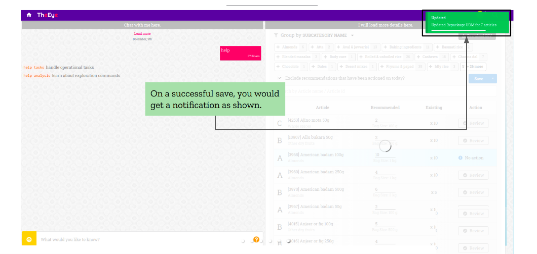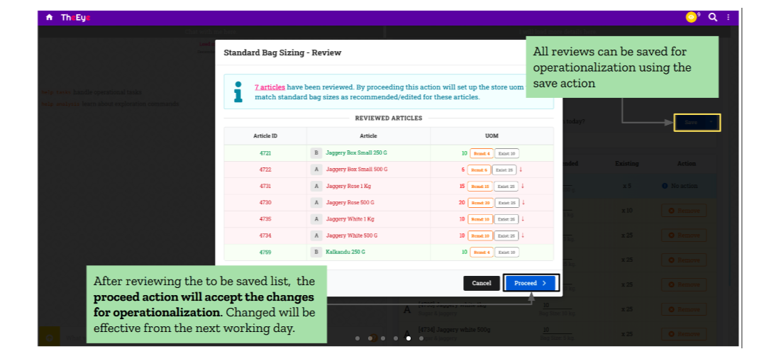 To view recommendations on standard bag size recommendations, issue the command articles to repack and navigate to the 'Standard Bag Size' tab. The listing shown here has UOM recommendations that you can accept. To accept recommendations, review the ones you would like to accept and then use the save option to accept all the reviewed recommendations in one shot. Other short hand actions in the save drop-down are available for quick review. The save confirmation dialogue also gives you the list of article UOM recommendations that are being accepted with the changes.