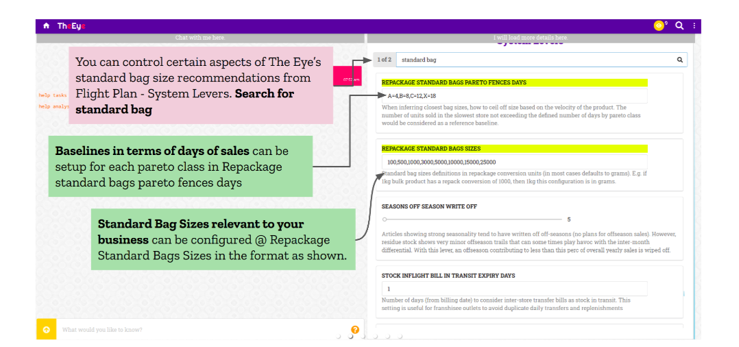 Fortunately, The Eye can identify batch sizes based on demand in your stores and the gram-mage of the products that you stock. Set up the standard bag sizes as described below in Flight Plan - System Levers (search for standard bag size). Ensure to read the documentation below the configuration before editing as the effective number system is in tied to the repackage conversion factor setup in your item master.